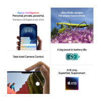 - SUPER-SMART A18 CHIP — A18 jumps two generations ahead of the A16 Bionic chip in iPhone 15. It enables Apple Intelligence, powers advanced photo and video features, and supports console-level gaming, with exceptional power efficiency.