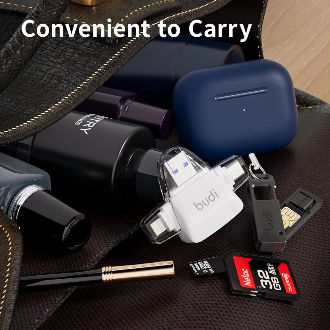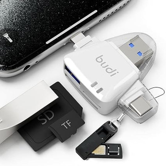 The Budi 6-in-1 Card Reader + SIM Card Ejection Pin / TF Card Storage Small Box (Model: CP581W) is a compact, multifunctional accessory designed to streamline data transfer and storage needs for various devices.