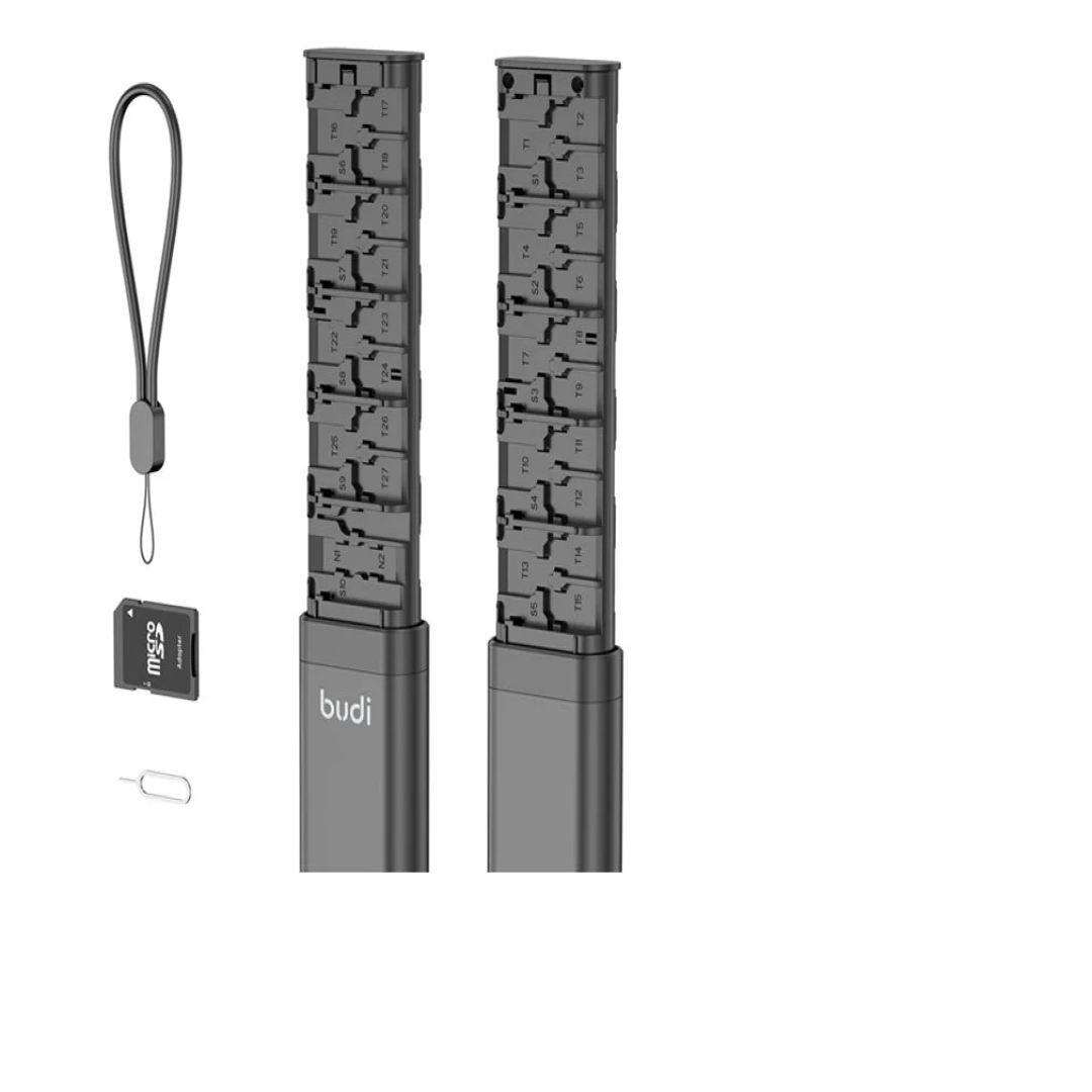 The Budi Multifunction Storage Stick (model DC536CB) is a versatile accessory designed to manage and organize various memory cards and SIM cards efficiently. This storage solution is ideal for professionals and enthusiasts who handle multiple devices and require a compact, organized method to store their cards.