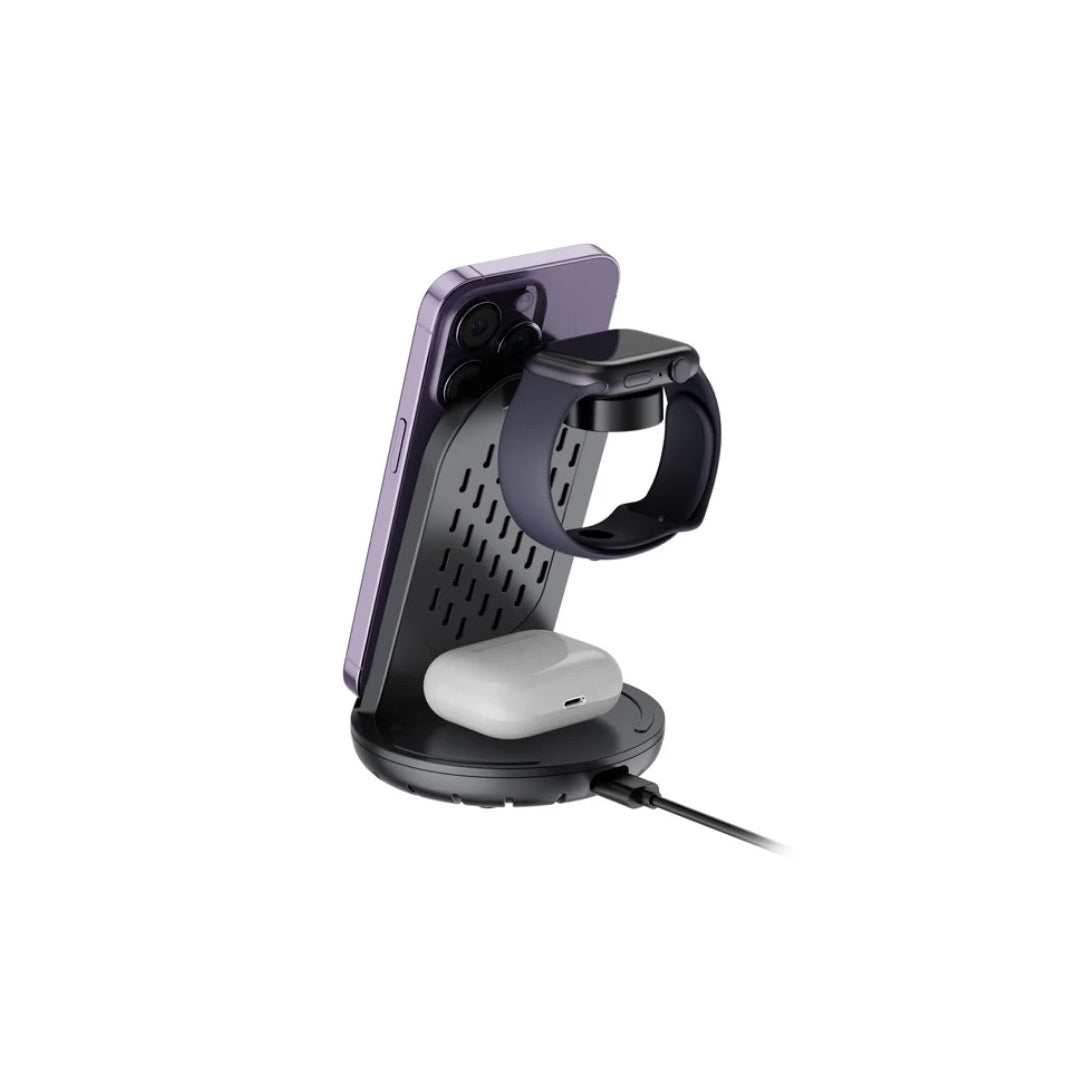 - 3-in-1 Wireless Charging: Charges your smartphone, smartwatch, and wireless earbuds at the same time.